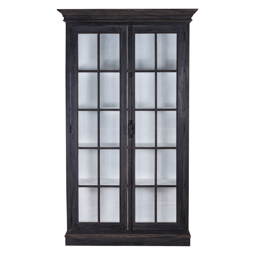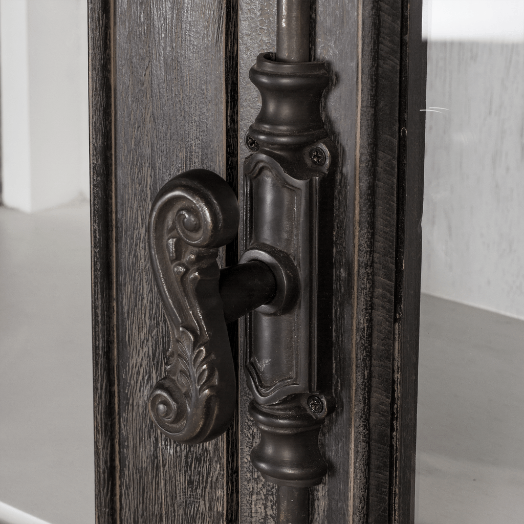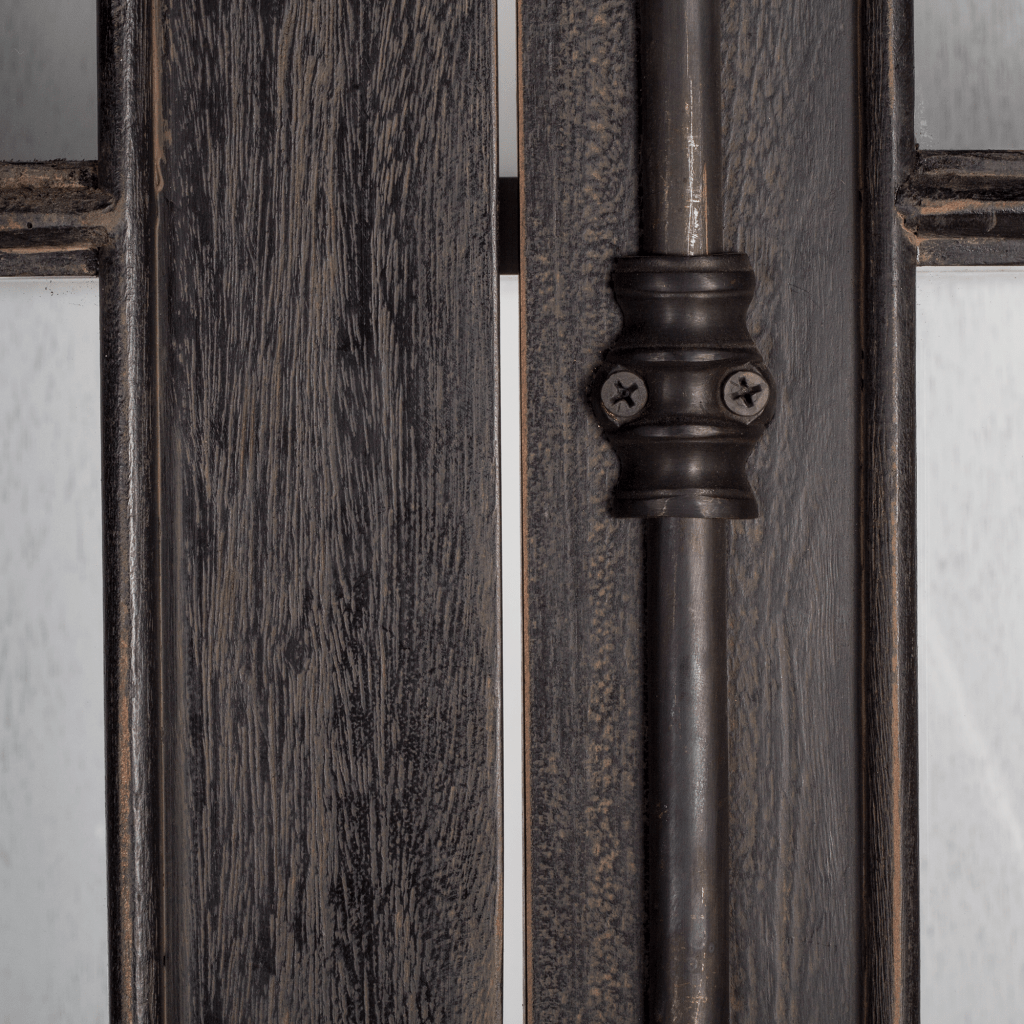 This French Cabinet Mahogany Glass Doors made of solid mahogany reclaimed pine. The classic style cabinet is completed with two hinged doors with fine glass and French casement style hardware in lightly Black antique iron works.