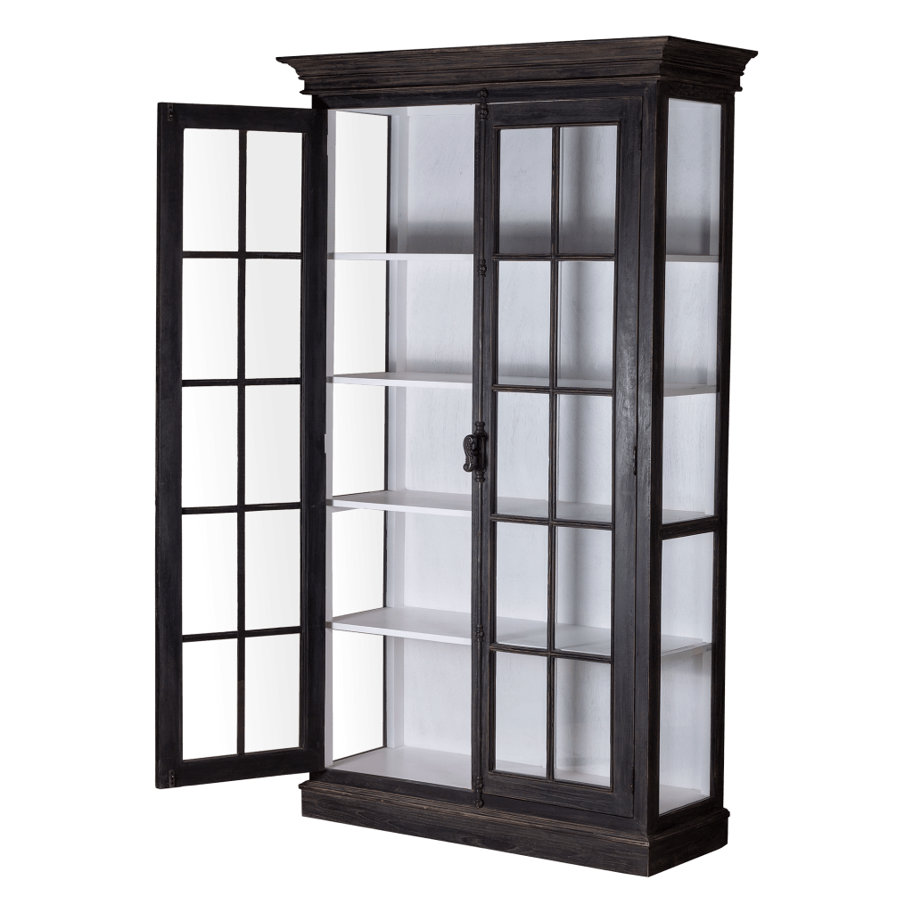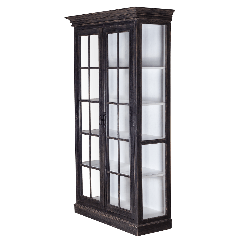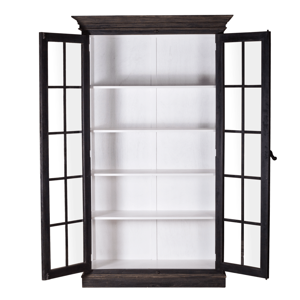 This French Cabinet Mahogany Glass Doors made of solid mahogany reclaimed pine. The classic style cabinet is completed with two hinged doors with fine glass and French casement style hardware in lightly Black antique iron works.