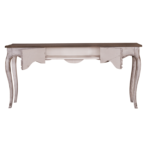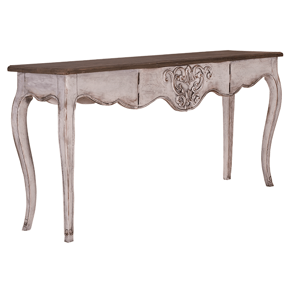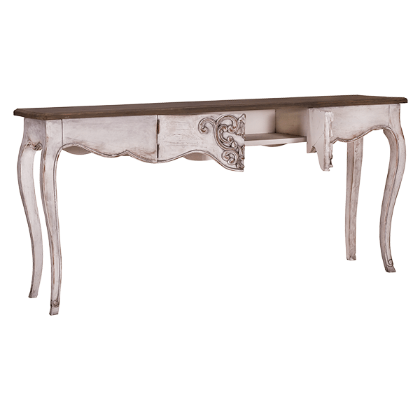 This romantic console table mahogany is constructed by the combination of simple lines of the saber style legs, middle carvings and peak – a boo drawer. This whole combination of the romantic lines and antique finish will bring elegance to any room that need vintage appeal.