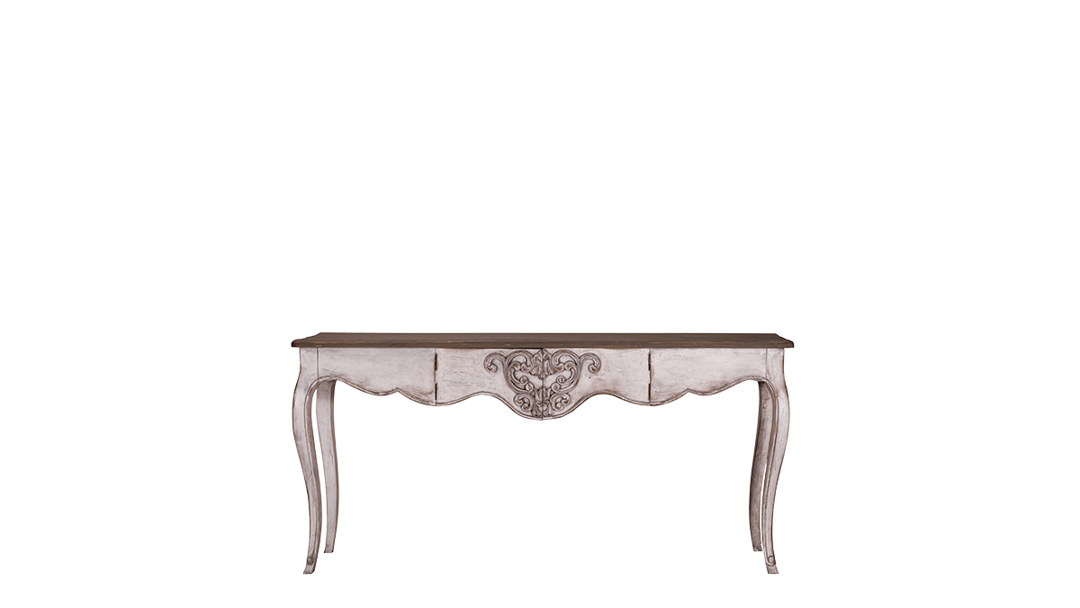 This romantic console table mahogany is constructed by the combination of simple lines of the saber style legs, middle carvings and peak – a boo drawer. This whole combination of the romantic lines and antique finish will bring elegance to any room that need vintage appeal.