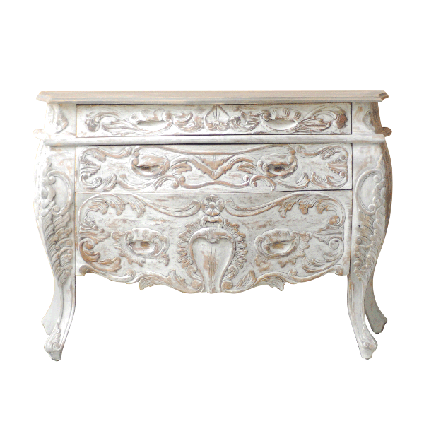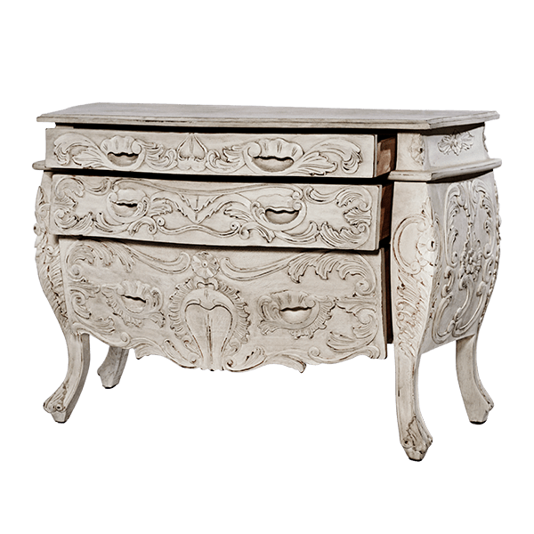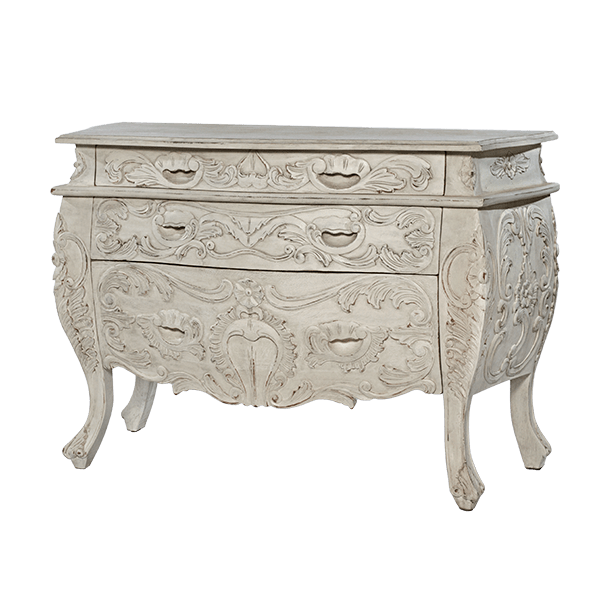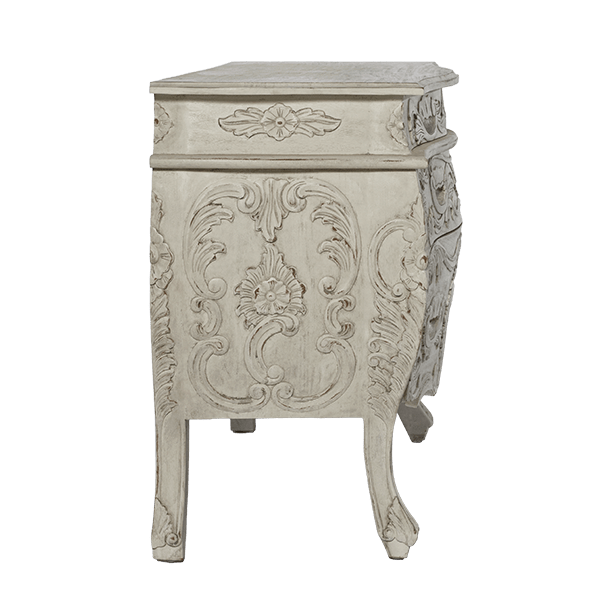 This highly ornate Rococo styled, 3 intricately carved drawer chest is handmade and created out of carved, solid mahogany. Set inside a beautifully designed frame, the detailed, hand-painted finishes make it the perfect companion from bedroom to living room.